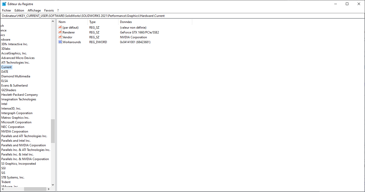 As the picture, you have to write \HKEY_CURRENT_USER\SOFTWARE\SolidWorks\SOLIDWORKS (version)\Performance\Graphics\Hardware\Current in the bar. You will see the same page as the picture.